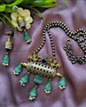 Ekani Ruma Silver Lookalike Blue Turquoise Dual Tone Monalisa Stones Studded With Pearl and Chemical beads droplets With S Hook Closure Ball Chain Along With A Pair Of Matching Stud Earrings.