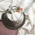A stunning pair of earrings that feature a striking combination of red and blue semi precious stones with intricate detailing exc. This earrings is crafted in alloy silver, featuring delicate pastel designs. These statement silver polish earrings are sure to make all heads turn. Pair this up with your solid chinkari kurtas or even your shiny tussar silk saree, these earrings are a keeper.